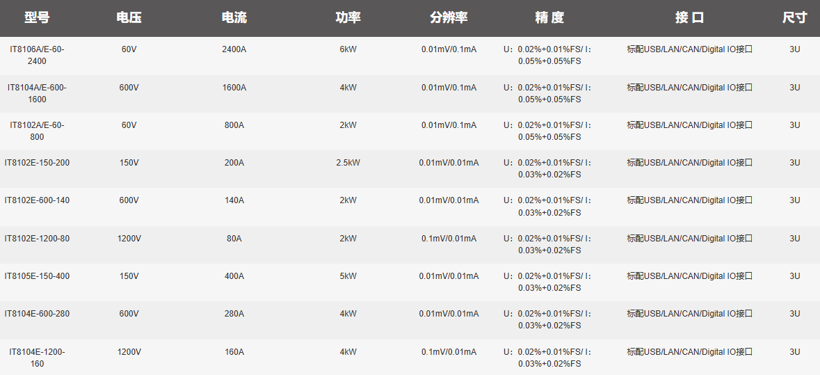 艾德克斯IT8100A/E系列高速大功率直流电子负载是新一代图形化可编程电子负载,结合触摸屏与图形化界面,提升参数设定与波形编辑的便捷性。在仅3U空间内实现最高7.2kW功率密度(150V机型),支持光纤主从并机,轻松扩展功率范围。提供60V、150V、600V、1200V三种电压规格,功率范围覆盖2kW至86.4kW,具备高速电流爬升能力与多种工作模式,如动态模式、自动测试、基础与进阶带载模式,广泛适用于电源模块、AI服务器电源、燃料电池、充电桩、功率电子及工业电机等测试场景,为研发与产线测试提供强大支持。