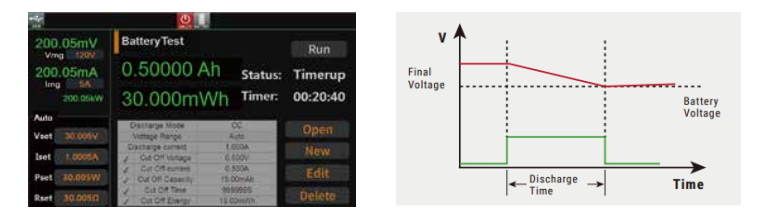 IT8100A/E系列高速大功率直流电子负载具有电池放电功能,可使用恒流、 恒电阻或恒功率模式下进行放电测试。可自行设置放电截 止条件:关断电压、关断容量及放电时间,三者中任一种条 件满足,放电停止。测试过程中可观测电池的电压、时间和 已放电容量。