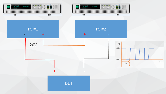 推荐方案:通过两台电源,两端正极和正极连接,两端的负极分别接DUT的正极和负极。其中1输出恒定的20V,,#2电源通过list编辑0V和40V的1Hz的电压波形。当#2处于0Vlevel时,则加载在DUT两端的电压为20V当#2输出40V时,则加载在DUT两端的电压为+20V并实现连续的正负电压切换。