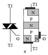 三端双向交流开关(TRIAC=TRIode(三端)ACsemiconductorswitch)实质上是双向晶闸管,它是在普通晶闸管的基础上发展起来的,它不仅能代替两只反极性并联的晶闸管,而且仅用一个触发电路,是目前比较理想的交流开关器件。其中,双向晶闸管(TRIAC)是由NPNPN五层半导体材料构成的,相当于两只普通晶闸管反相并联,它也有三个电极,分别是主电极T1、主电极T2和栅极G,如图1所示。