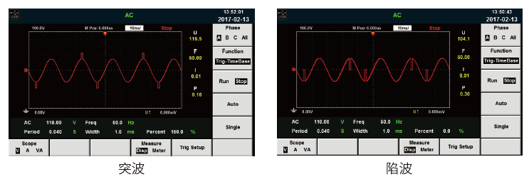 艾德克斯IT7300高性能可编程交流电源的特征:①通过STEP模式和LIST模式,为用户提供简单易行的方式来实现输出参数逐步或连续的变化;②输出电压的幅度、频率、相位、波形等参数也可以通过对仪器内的内部触发或外部触发的控制来输出。其中,以艾德克斯IT7300交流电源为例,阐述具有的作用。一是,可以模拟各种电源瞬间断电、突波、缓升等特性。其面板结构及其相应波形效果图 如图1-图4所示