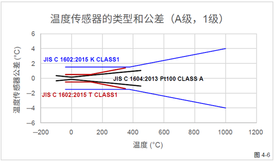 图1 铂电阻温度计(A级)和热电偶K、T(1级)的公差。