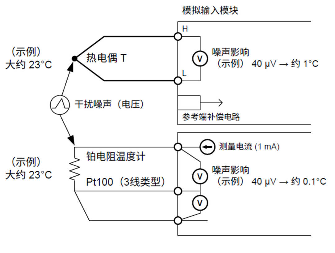 如图3所示,加入一个相同的40uV电压噪声,T型热电偶由于噪声产生的温度约1℃,而相同的噪声在pt100上产生的温度是0.1℃。