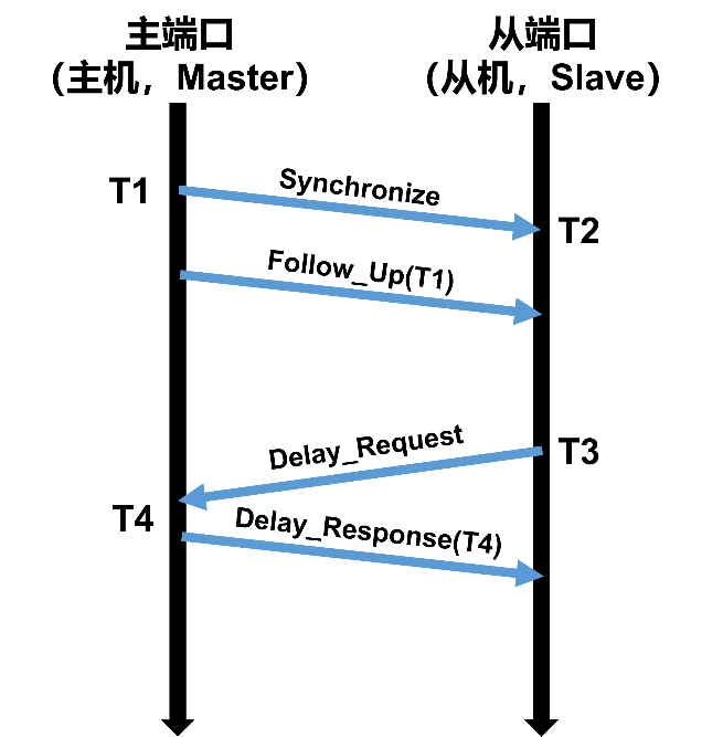 我们将应用了PTP协议的网络称为PTP域。在此域中,有且只有一个同步时钟,域内的所有设备都与其保持时间同步。通常需要有一个“主端口(主机)”机器发送同步时钟信号,并配合更高精度的延时测量算法,使其他机器以“从端口(从机)”的形式与同步时钟信号始终保持高精度的时间同步关系如下图。