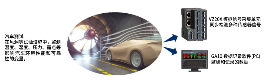 当与GA10 软件结合使用时,可以多通道快速、准确地采集和监控同步数据,确保汽车零部件测试和开发的高质量结果。此外,由于其优异的抗噪能力,即使被测设备本身含有噪声源,如变频器(功率转换器) 等,该产品也能够准确地采集数据。