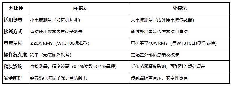 内接法:直接通过仪器端子测量,适合小电流(如待机功耗测试)。