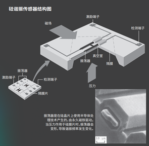 压力计的原理是:由共振传感器将气体压力转化为频率信号,再由压力传感器将频率信号转化为压力值。共振传感器包含传感器部分和激振电路部分。激振电路由两个加工在单晶硅上的H型振子(振荡器)组成。受到气体压力时,一个受拉力,一个受压力,从而产生与作用压力成正比例的高差压输出(图2)。