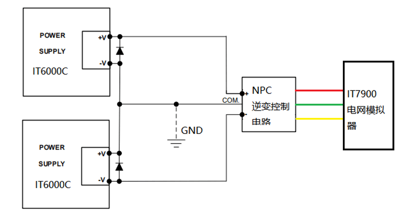 2台 IT6018C-800-75串联输出,公共点Com接地模拟1/2Vo、0、-1/2Vo三电平输入,其输出端接IT7930-350-60作为电网模拟器模拟电网环境。