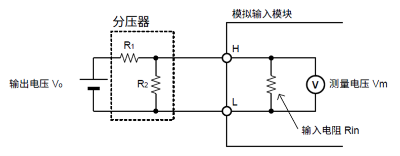 测量的是分压器输出的直流电压,H、L是GP20输入端子,分压器的内部电阻R2和模拟输入模块中的输入电阻Rin并联,会产生一个新的组合电阻R',导致测量电压Vm产生测量误差。