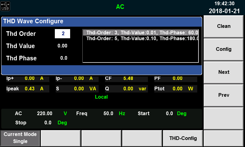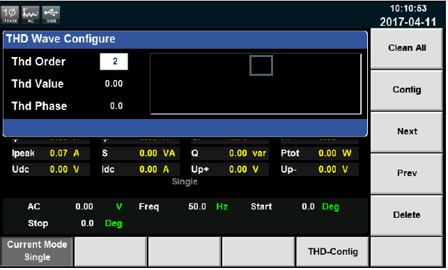 1.在IT7600主界面选择THDWave,页面的正下方会出现THD Config 的页签,按[THD Config] 进入“THD Wave Configure”界面,如下图所示。