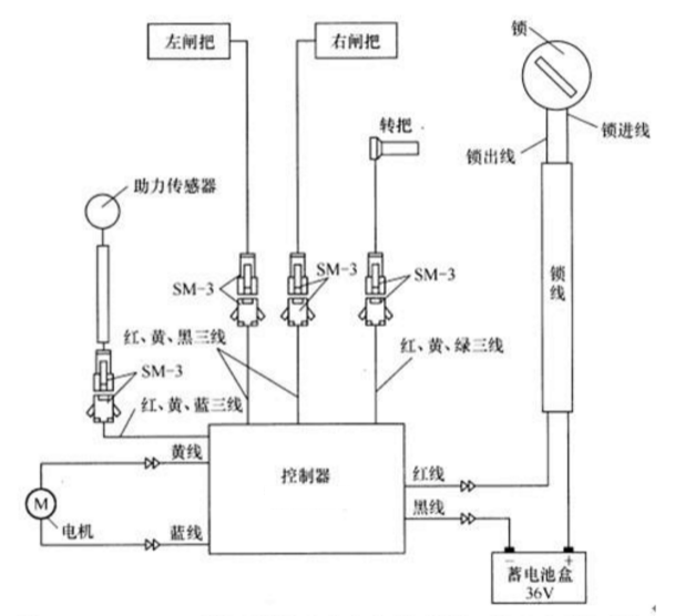 电动车控制器,即直流无刷电机控制器,由控制器、电机、转把、闸把、助力传感器等构成的电机驱动、控制系统如下图二所示: