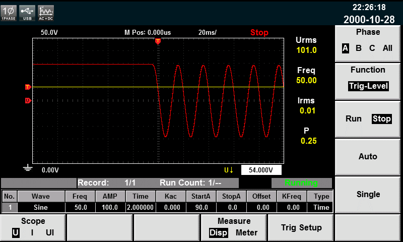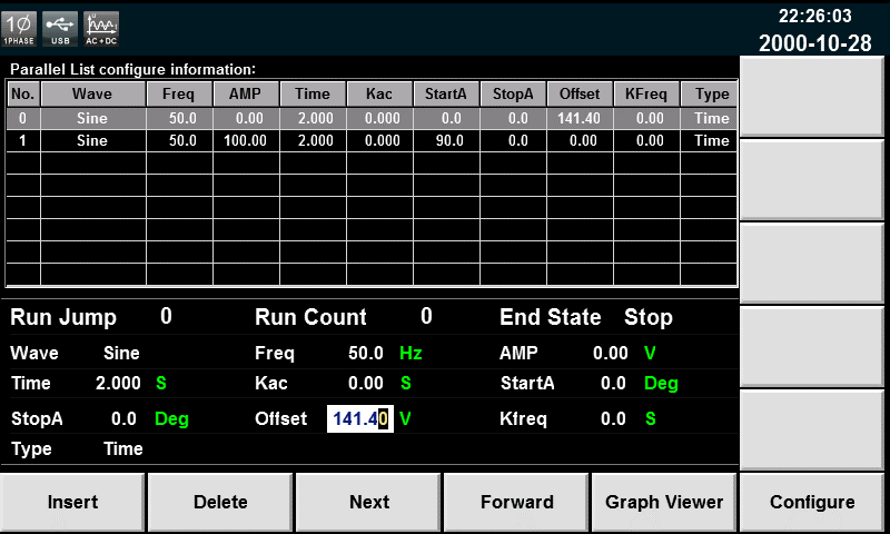 为了确保交流和直流输出之间的转换可瞬时发生,用户需要编写一个小的瞬态程序,以在100Vac和141.4Vdc之间转换为例。这可以使用IT7600系列电源的list功能完成,并可在屏幕面板的波形显示界面直接查看,无需示波器更加方便。每一步都可以设定波形、频率、幅值、停留时间、AC幅值斜率、起始/终止相位角、直流偏置、频率斜率、触发模式。图三显示了IT7600的list的设置界面,高分辨率大屏幕让设置一目了然,更配有免费的上位机软件IT9000,可以在电脑上远程控制机器的输出。