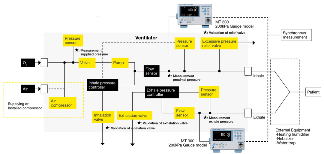 在这种应用背景下,测量设备必须检查气源和压力传感器之间的压力损失。必须确保传感器准确测量切换时间,以保证呼气和吸气之间切换时阀门正确运行。