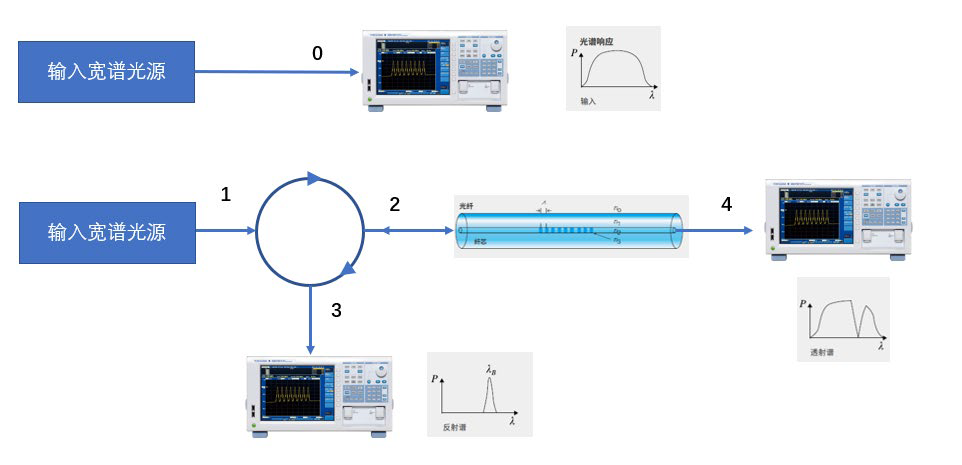 *图3中,环形器1端口为输入光源,2端口为FBG输入,3端口为FBG反射端口。0端口为光源直接连接光谱仪,4端口为FBG透射端。