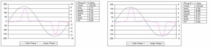 高峰值电流和失真电流也会影响交流电源,使得电压失真,因为它们会影响电源的输出阻抗。电源输出阻抗越低,影响就越小。图2显示了高失真电流对输出电压的失真影响。当电流达到电压波形顶部附近的峰值时,电压会被拉低,产生平顶。为了减轻这种影响,可以在一些允许输出阻抗减小的交流电源机型上提供可编程输出阻抗特性。