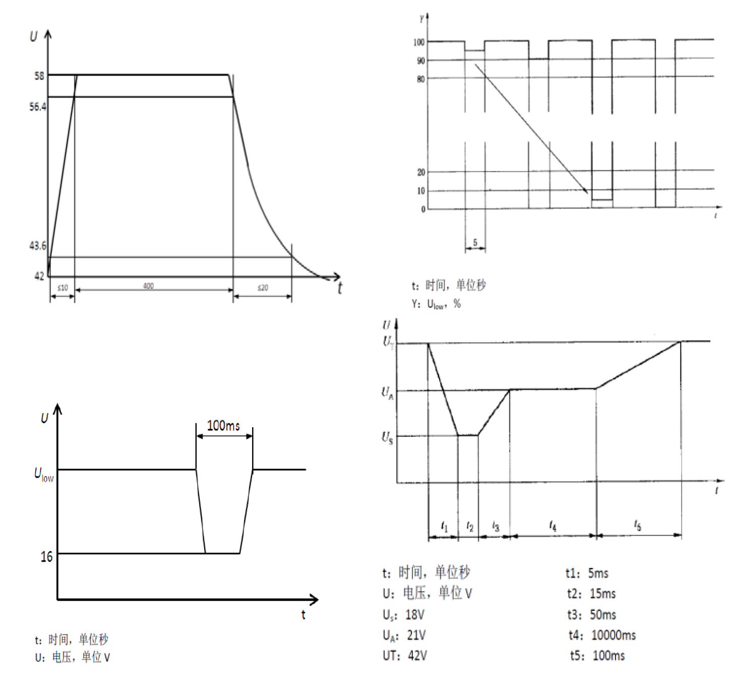 ISO 21848标准针对42V供电车辆提出了汽车电气电子设备的环境条件试验要求,新增波形包括该标准中最大动态电压、电压骤降复位性能、电压瞬时下降、启动特性等四个波形。IT6500C系列具有高速高性能的输出能力,可轻松完成汽车电子毫秒级测试需求。